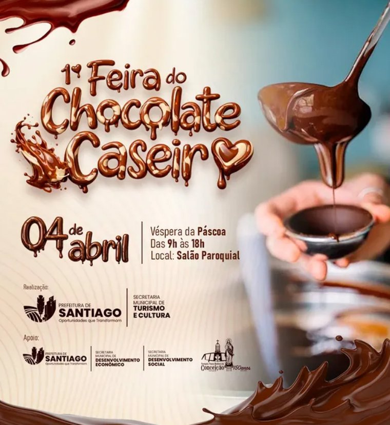 A Páscoa em Santiago terá uma novidade deliciosa: neste sábado (véspera da Páscoa), será realizada a 1ª Feira do Chocolate Caseiro, das 9h às 18h, tendo por local o Salão Paroquial da Matriz.