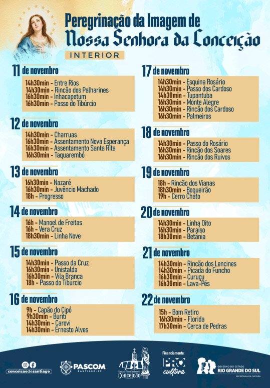 Entre as atividades anunciadas, também estão o passeio ciclístico até a Capela São Thiago, no dia 7 de dezembro, e. Além disso, a programação inclui o Memorial dos 150 anos da Paróquia e o momento solene de oferta de uma coroa de flores na Coluna Coluna da Imagem de Nossa Senhora da Conceição, na Praça Moisés Viana.