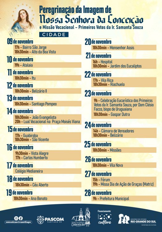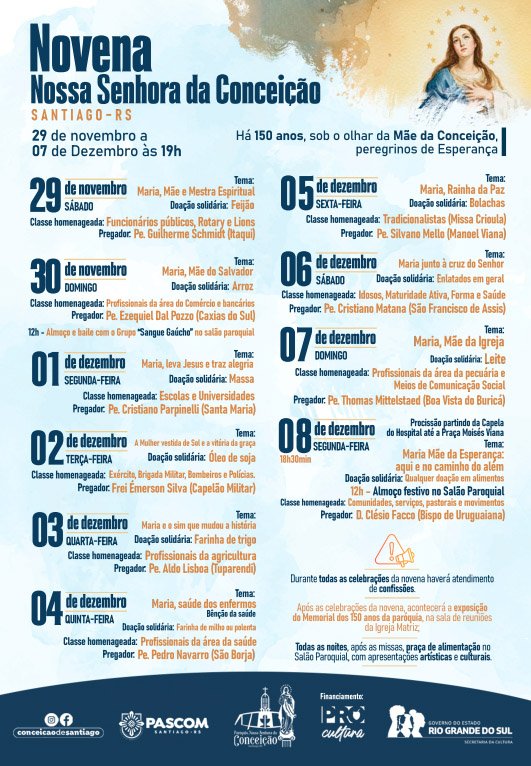 Alegria, união e fé reunindo a comunidade católica: esses são – de acordo com o pároco Aodomar Wandscher – os ingredientes principais da festa em honra a padroeira do município. Uma das atrações principais será a vinda do padre Ezequiel Dal Pozzo, cantor, compositor e um dos maiores influenciadores digitais, com mais de 1 milhão de seguidores em suas redes sociais. O padre Ezequiel estará em Santiago no dia 30 de novembro, onde celebra missa e após realiza uma grande apresentação.