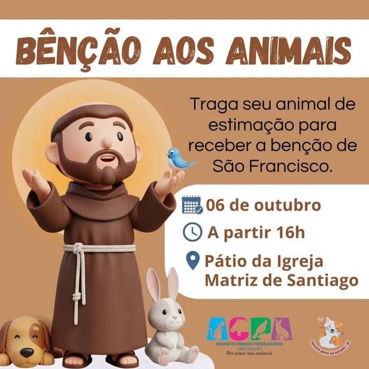 A celebração que conta com a apoio da ACPA – Associação de Proteção e Conservação dos Animais. será a partir das 16h . no pátio da Igreja Matriz, no centro da cidade. Haverá também adoção de animais e quem quiser ainda poderá fazer doação de ração aos animais abandonados.