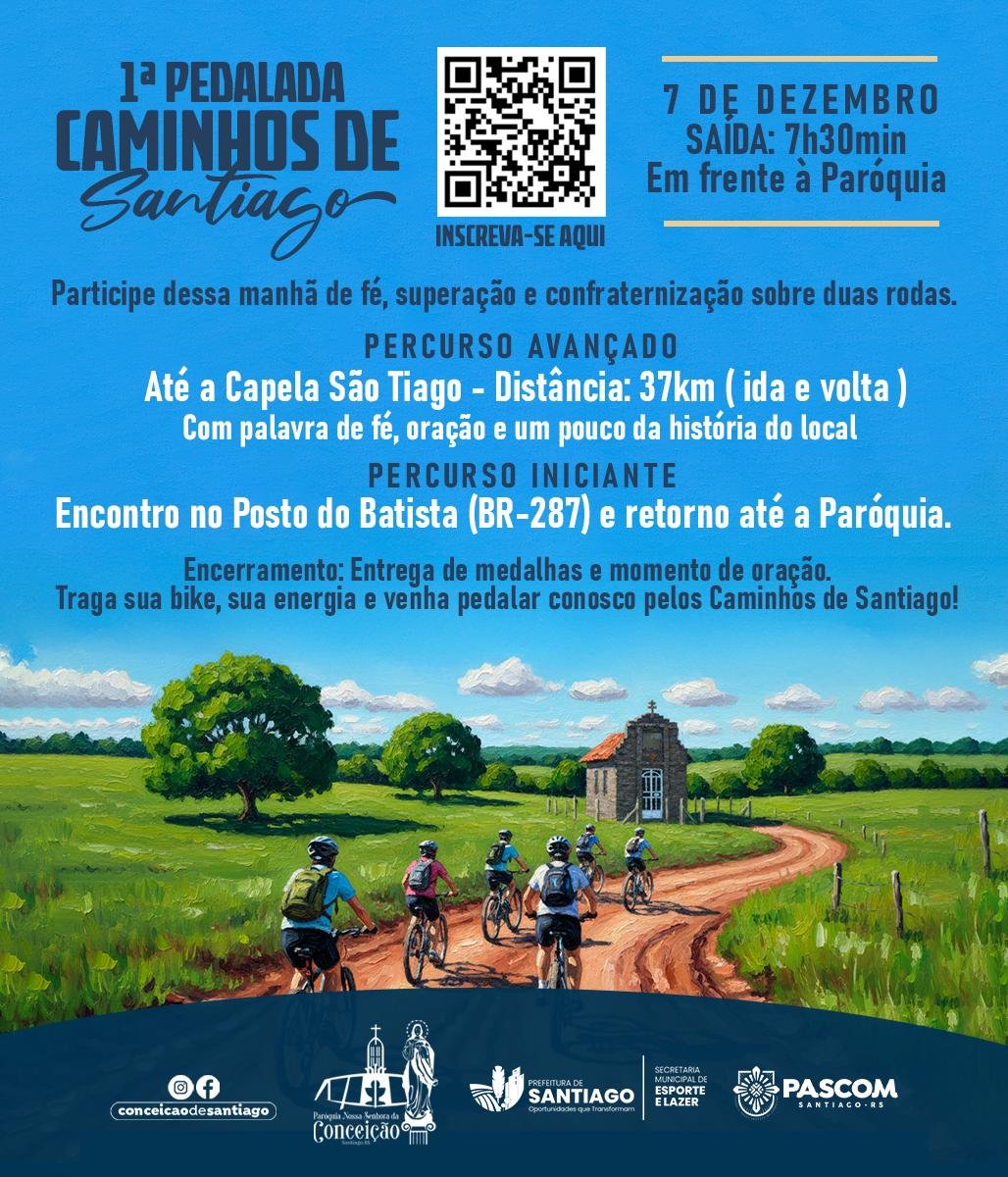 Para homenagear Nossa Senhora da Conceição será realizado um passeio ciclístico que marca os 150 anos de paróquia de Santiago. O destino é um lugar histórico dos primórdios de nosso município, a capela de “São Thiago”.