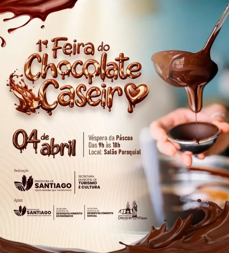 A Páscoa de 2026 em Santiago terá uma novidade deliciosa: no dia 4 de abril (véspera da Páscoa), será realizada a 1ª Feira do Chocolate Caseiro, das 9h às 18h, tendo por local o Salão Paroquial da Matriz.