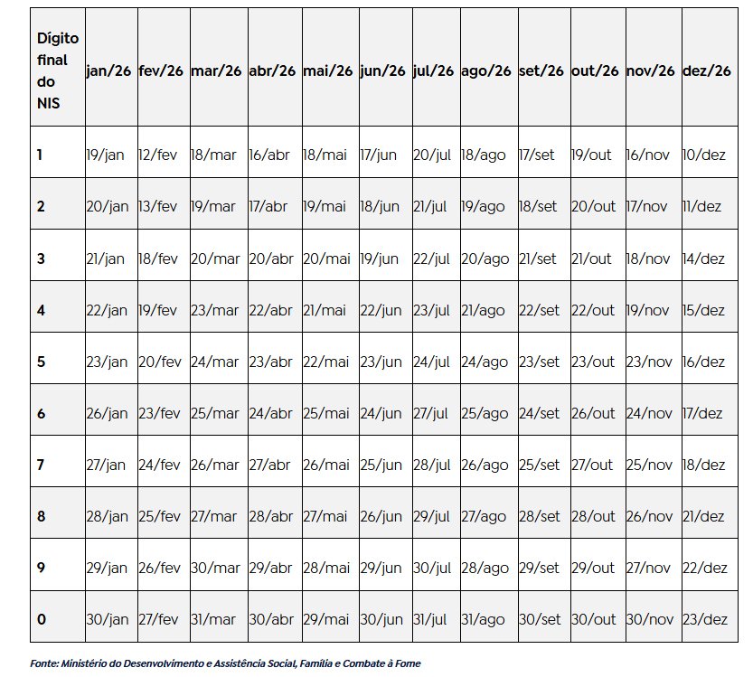Os pagamentos ocorrerão nos últimos dez dias úteis de cada mês, de forma escalonada conforme o dígito final do Número de Inscrição Social (NIS), exceto em dezembro, quando o cronograma é antecipado em cerca de uma semana por causa do Natal.