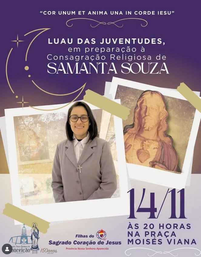 A Congregação das Filhas do Sagrado Coração de Jesus, em comunhão com a Paróquia Nossa Senhora da Conceição de Santiago, realiza no dia 14 de novembro o Luau das Juventudes, momento de oração, convivência e preparação à Consagração Religiosa de Samanta Souza.
