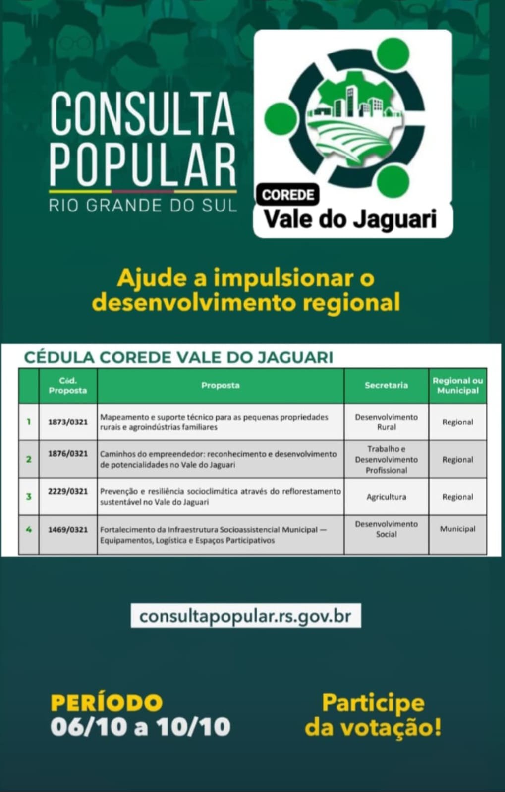 Começou nesta segunda-feira (6) a votação da Consulta Popular 2025. A população gaúcha poderá escolher até três propostas regionais para serem incluídas no orçamento estadual do próximo ano. A votação segue até a sexta-feira (10), de forma on-line ou por WhatsApp. A votação on-line estará disponível no portal oficial da Consulta Popular.