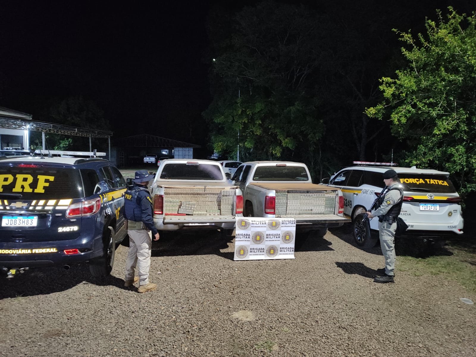 Durante operação de combate ao crime, as equipes policiais realizaram a abordagem de quatro veículos e seis pessoas em um bar na beira da BR-287. Os agentes localizaram duas Amaroks, uma emplacada em Rio Grande e outra em Erechim, carregadas com mais de 20 mil maços de cigarros cada uma. O material tem origem estrangeira e foi introduzido ilegalmente no país.