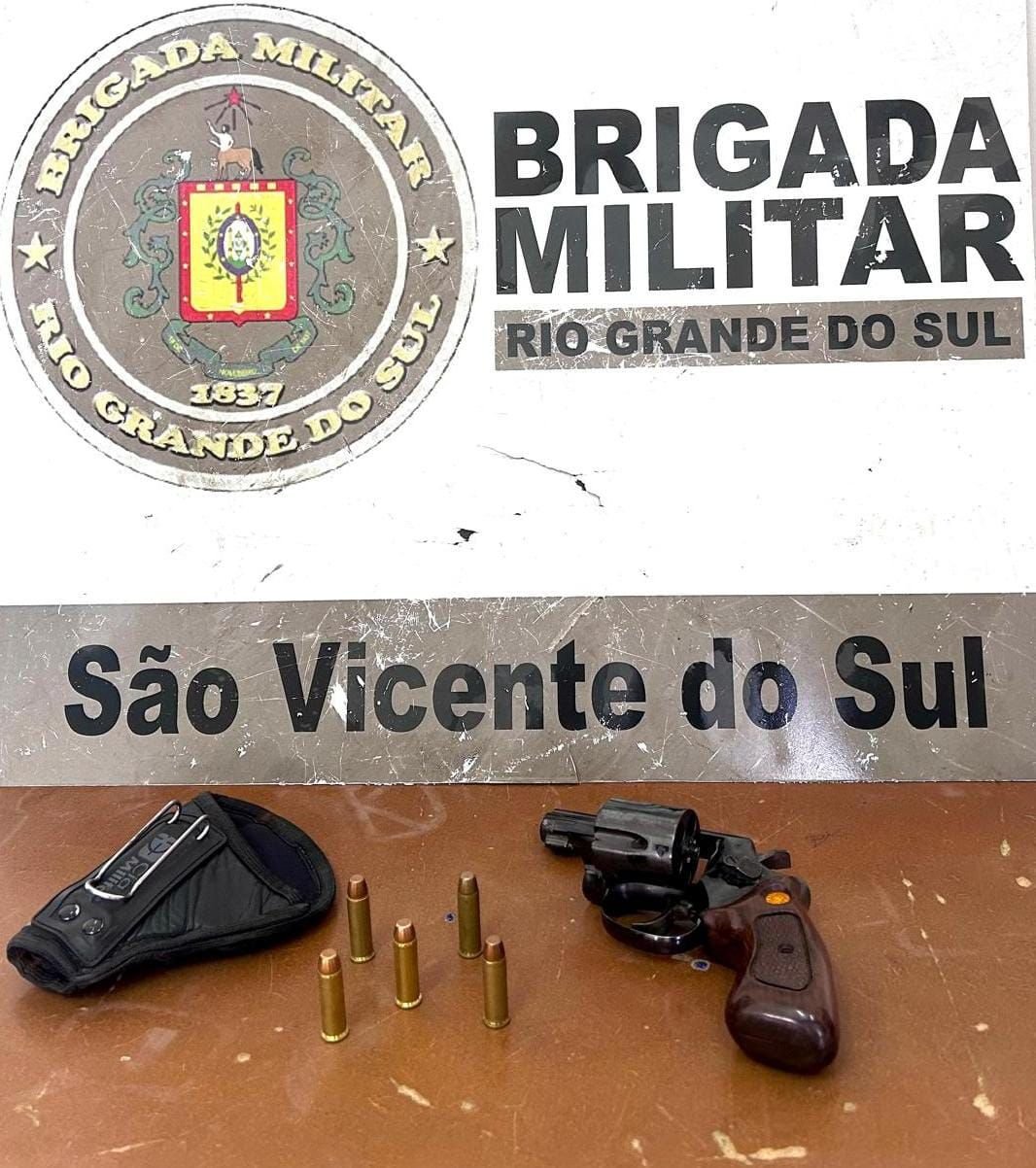 Após ser detido pelos Policiais, foi realizada revista pessoal, não sendo encontrado nada ilícito inicialmente. Em busca pelo objeto arremessado, a guarnição localizou uma arma de fogo calibre .38, municiada, com numeração raspada.