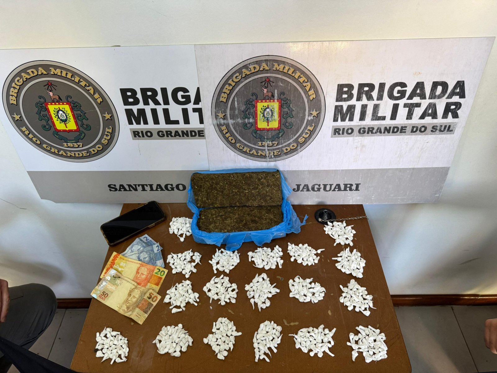 Em ato contínuo, os policiais averiguaram o local e constataram a existência de dois tijolos de maconha, pesando 983,04 gramas, além de 540 buchas de cocaína, totalizando 192,53 gramas. Também foram apreendidos R$ 74,00 em dinheiro e um aparelho celular iPhone 11.