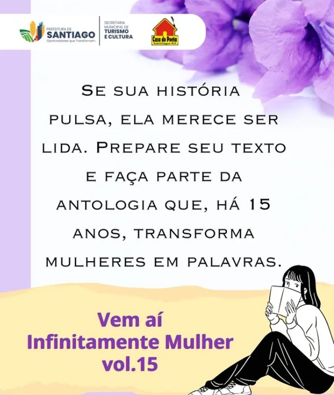 Quinze anos de passaram e em 2026, a obra literária Infinitamente Mulher vai debutar. Para o presidente da Casa do Poeta, Ronaldo Prestes Gomes, o Infinitamente Mulher foi crescendo com os anos, até se tornar uma referência para outras cidades.