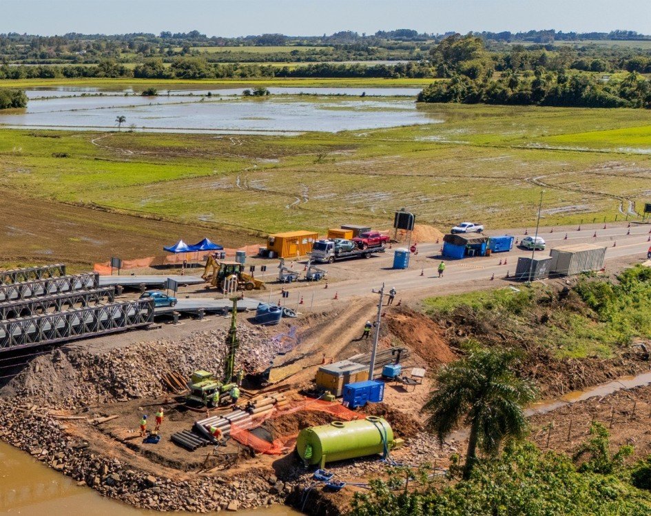 A rodovia foi uma das mais afetadas pela catástrofe climática de 2024. Desde a queda da estrutura sobre o Arroio Grande, o tráfego na região foi mantido com apoio do Exército Brasileiro, que instalou pontes metálicas provisórias. Elas serão desativadas após a entrega das novas obras.