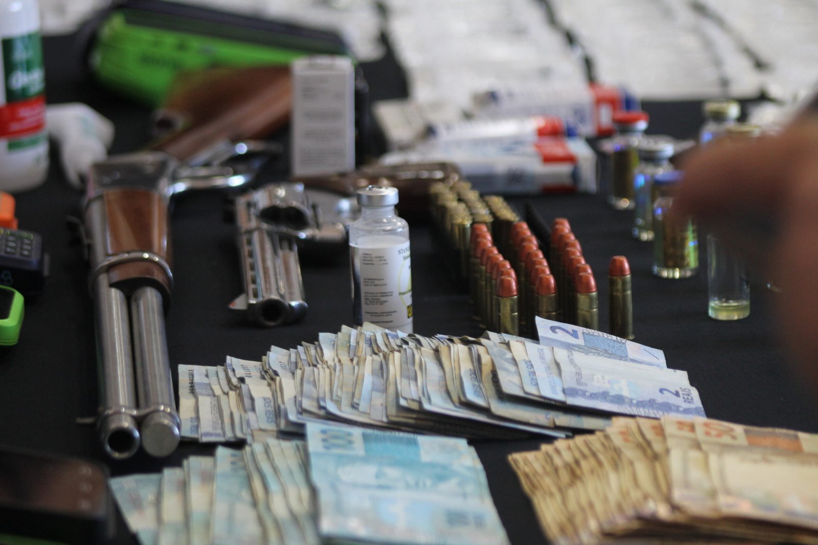Durante o cumprimento dos mandados de busca e apreensão na residência do suspeito e nas academias, foram localizadas duas armas de fogo e munições, anabolizantes, seringas, documentos, celular, máquinas de cartão de crédito e 7.521,00 em dinheiro.