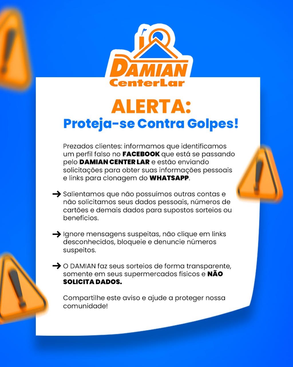 Não caia nesse golpe, o Damian faz seus sorteios de forma transparente, somente em seus Supermercados físicos e NÃO SOLICITA DADOS.