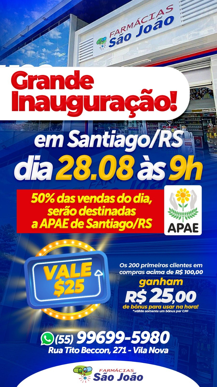 As Farmácias São João inauguram no dia 28 de agosto a sua quinta loja em Santiago, localizada na Rua Tito Becon, 217, bairro Vila Nova.