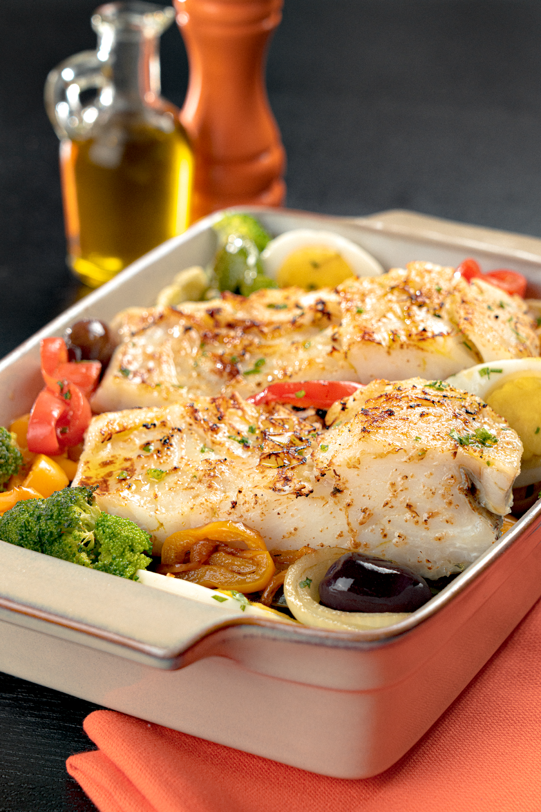 - Distribua os ovos cozidos em rodelas e as azeitonas pretas + brócolis