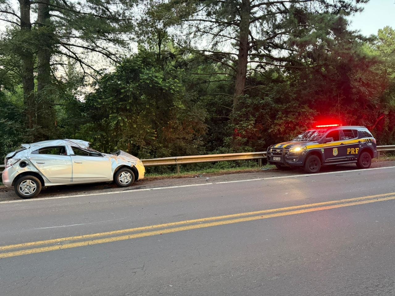Por volta das 4h, deste sábado, no km 363 da BR-287, em Jaguari, a Polícia Rodoviária Federal atendeu um acidente do tipo saída de pista seguido de capotamento, envolvendo um Onix emplacado em Jaguari.
